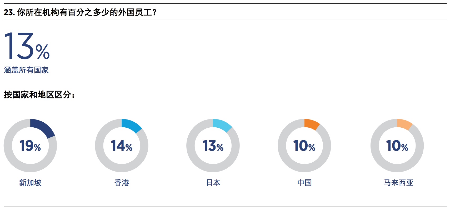在劳动力国际化程度方面,中国大陆的外籍员工比例达到10%,同比增长了4%。然而中国大陆在雇佣外籍员工方面仍然落后于亚洲其他地区,与马来西亚同处于落后位置。新加坡(19%)和中国香港(14%)仍然是亚洲雇佣外籍员工最多的地区。