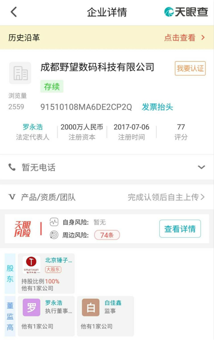 界面新闻记者第一时间通过天眼查获知,锤子科技半年前注册了一家名为野望数码科技的公司。其中,锤子科技持股比例为100%,罗永浩为法定代表人。