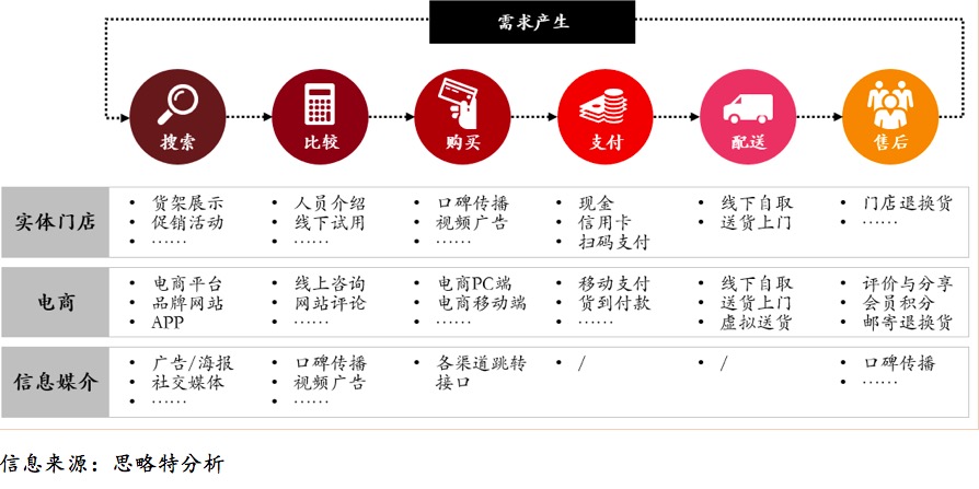 经过单一线下渠道、线上线下多渠道的变革历程,新零售下“场”的变化体现在消费旅程各个环节上的全渠道融合。从横向来看,我们将消费旅程分解为六个部分:搜索、比较、购买、支付、配送及售后。从纵向来看,我们观察到实体门店、电商PC端、电商移动端以及信息媒介的全渠道融合。并且,全渠道融合体现在消费旅程的每一个环节中(见图二)。