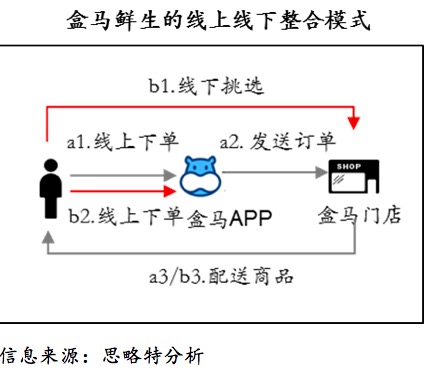 盒马鲜生商业模式的其中一个关键来自于线上线下的整合模式:通过实体门店实现建设品牌与引流、提升消费体验、扮演仓储物流中心,而线上APP则成为主要销售渠道以及搜集与分析消费者的界面。依据盒马鲜生的规划,60%-80%的销售要来自于线上(见下图)。
