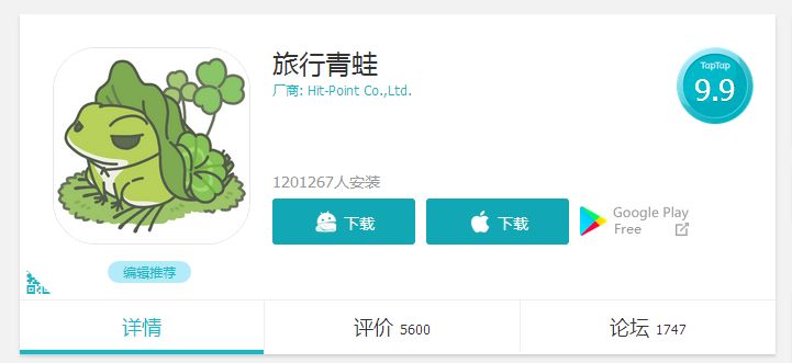 目前,《青蛙旅行》在官方尚未组织任何宣传活动的情况下,已经位于AppStore游戏免费榜第一位,超越了《荒野行动》与《王者荣耀》;在TapTap上下载量达到了110万,评分9.9分(满分10分);在B站游戏心中,关注度超过了网易的《边境之旅》。