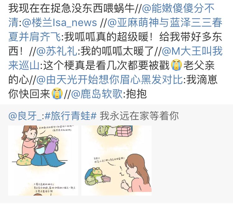 而这种常态在微博、B站等社区性强大的媒体平台上形成了一种与《青蛙旅行》相关的同人文化,玩家为青蛙制作拟人形象,各路KOL进行母亲角色带入后进行青蛙漫画的二次创作,将青蛙与《恋与制作人》的四位男性角色联系,总裁李泽言成了青蛙的爸爸,戏称“呱呱旅行就用用你爸爸的黑卡”。这成为更多女性玩家投身这款放置手游的原因,玩游戏不仅仅是游戏共情感,还有游戏背后的同人内容。