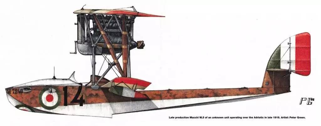 当时波鲁克和战友们驾驶的是意大利生产的有史以来最成功的飞行艇战斗机:马基M.5。马基M.5借鉴了德国Lohner的艇身设计,采用伊索塔-弗拉斯基尼V4B发动机,飞行速度非常快(117英里/小时)。