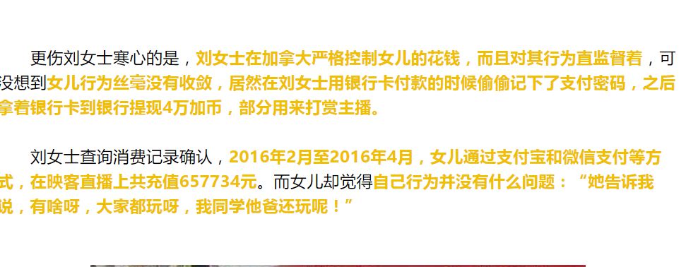 就像65万元打赏网络主播案例一样,“刘女士在加拿大严格控制女儿的花钱,而且对其行为直监督着,可没想到女儿行为丝毫没有收敛,居然在刘女士用银行卡付款的时候偷偷记下了支付密码,之后拿着银行卡到银行提现4万加币,部分用来打赏主播。”