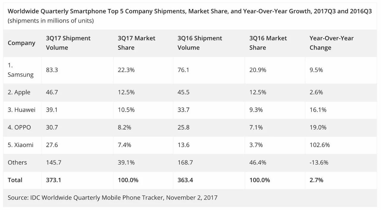2017年Q3全球手机销量,华为、OPPO、小米位列前五