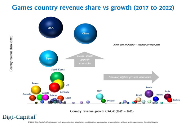 全球市场上,预计2018全球游戏收入或达到1700亿美元,手游占比超过35%。到2022年,手游带来的收入可占据整个游戏行业收入增长的40%。