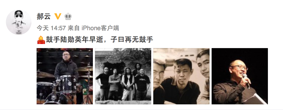1月23日,据新浪音乐报道,鼓手陆勋因病去世,年仅47岁。他曾担任子曰乐队鼓手、中国鼓手联合会全国鼓手大赛发起人、中国鼓手联合会常务副主席兼秘书长。郝云、苏阳等音乐人及业内人士发文悼念。