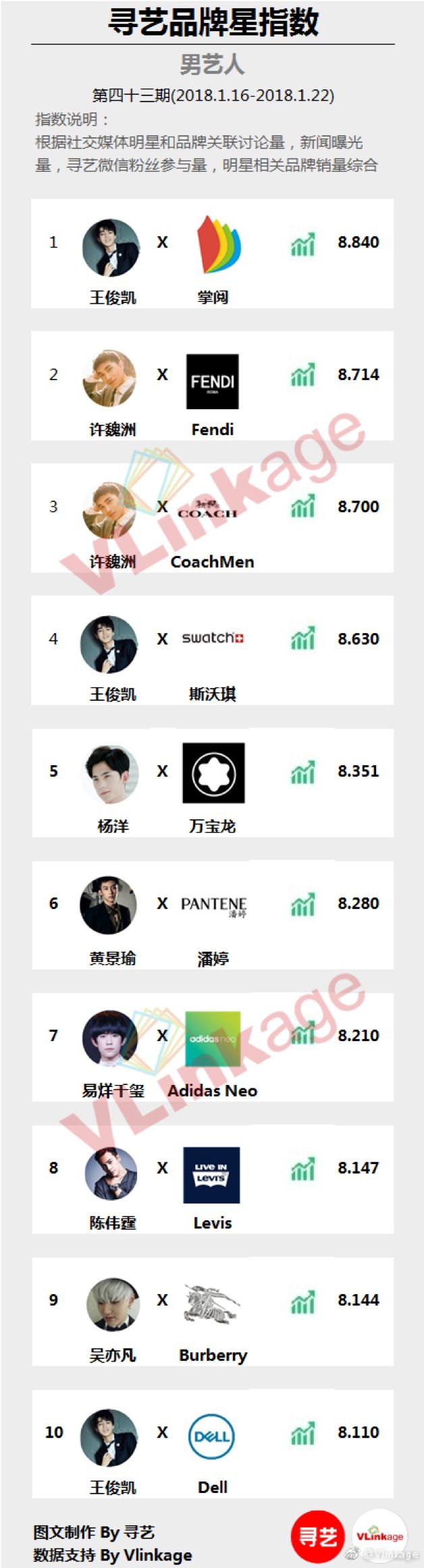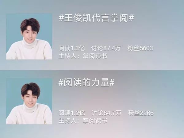 官宣当天,掌阅在微博中的两个话题阅读量分分破亿,在最近的艺人品牌排行榜中,王俊凯和掌阅也轻松登上榜首。