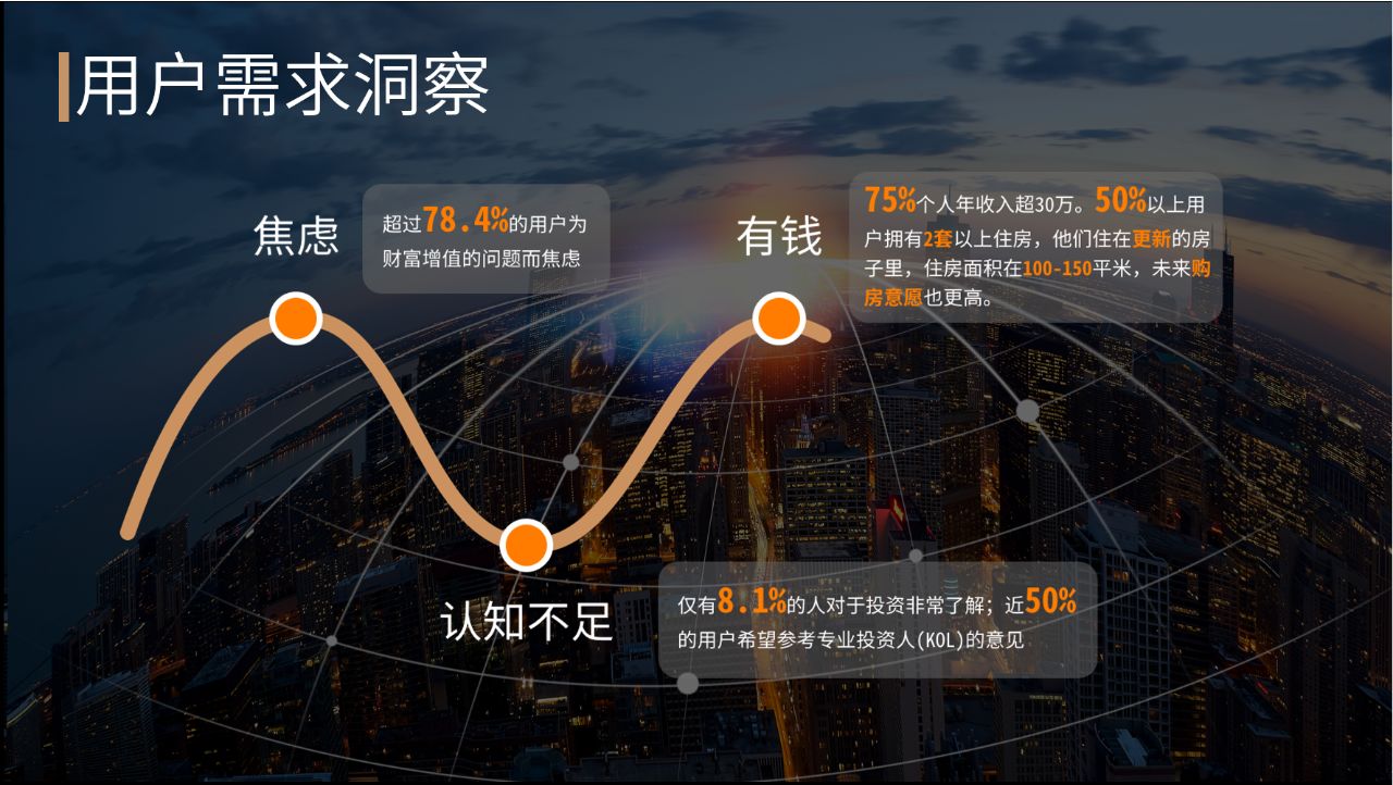 用户行为的洞察是什么呢?下半场我们要争取的新中产们,投资主要集中在股票、理财、房产、基金。同时二线城市的新财富人群对投资的认知更显不足。