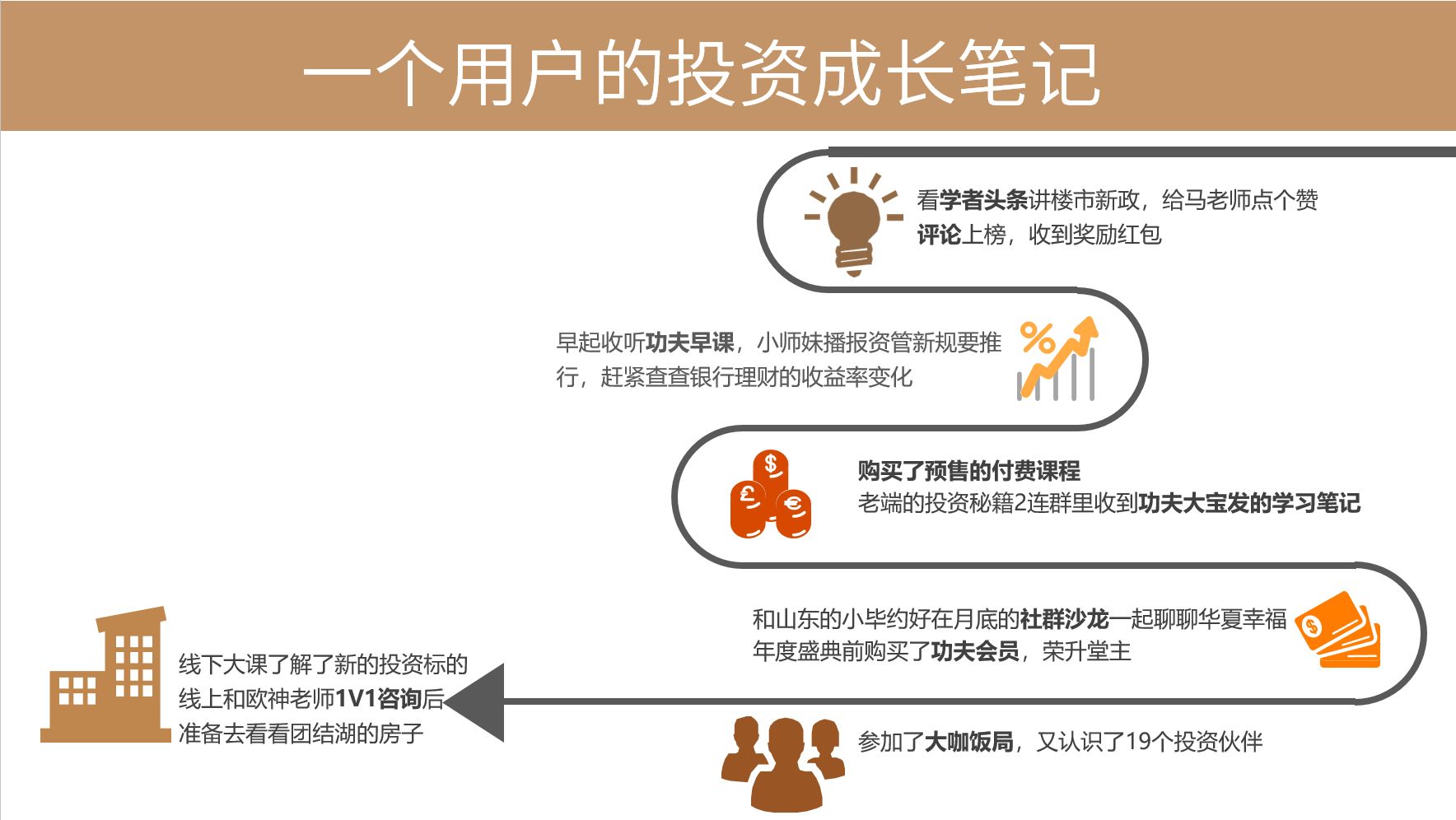 早上他起来可以看微信号,包括APP,学者头条会讲比如说楼市的新政,楼市要变天了。同时还会听资讯端,了解跟财经、跟理财发生的新的变化,算算自己的理财产品收益率有没有变化。同时购买投资方法论的课程,收到我们的课程助手发放的学习笔记。同时参加我们的社群沙龙,聊聊股市,购买功夫财经会员,荣升堂主,参加了大咖的饭局了,认识投资的伙伴。接下来和大咖一对一的咨询房地产,购置到一套满意的房产。