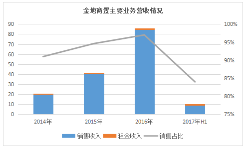 2017年中期,因来自大连汇泉、西安艺华年及上海山水四季城销售确认收入减少,金地商置物业销售收入大幅减少,但物业销售占比仍高达84%,商业平台属性还不明显。