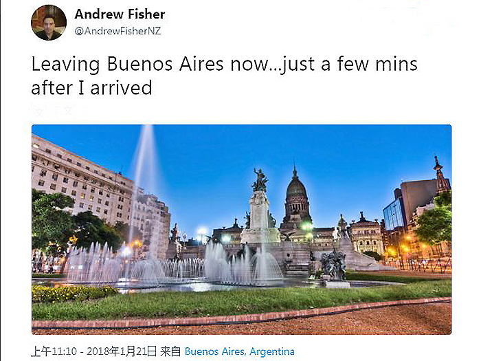 奥克兰时间21日晚20时,新西兰航空NZ30航班由奥克兰起飞,当地时间21日下午15时抵达阿根廷布宜诺斯艾利斯;