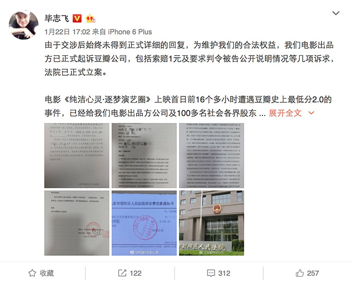 1月22日,电影《纯洁心灵 · 逐梦演艺圈》的导演毕志飞发布了一条微博,因遭遇豆瓣史上最低评分(2.0 分),宣布正式起诉豆瓣公司,并要求索赔一元和判令被告向原告公开书面致歉、消除影响、恢复名誉等几项诉求,同时表示法院已正式立案。