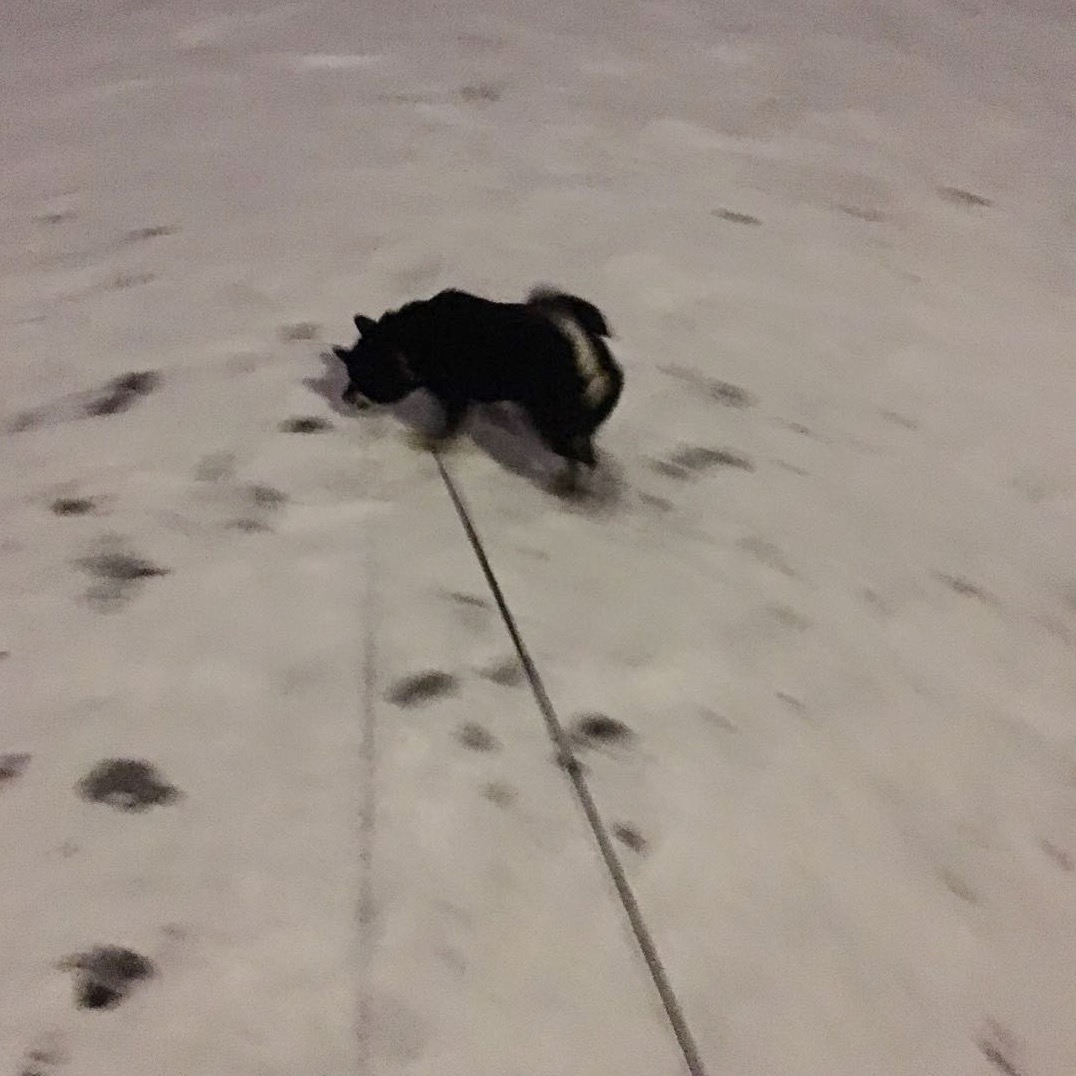 去年第一次下雪出去遛狗,狗子第一次见雪,兴奋到一直吃雪,鼻子埋进雪里像猪拱地一样。因为吃了太多,回家就尿了一地,把脚都泡了。