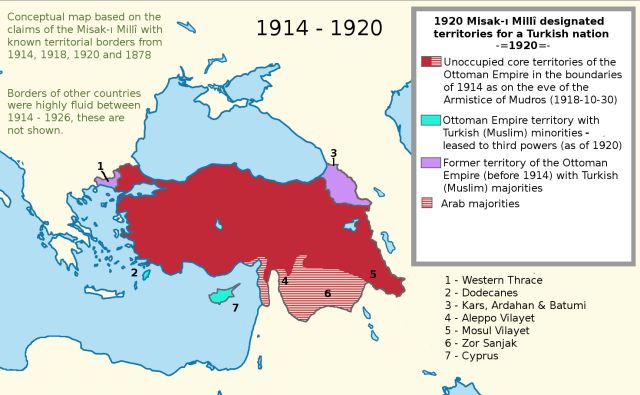 1920年最后一届奥斯曼帝国议会提出的构建土耳其民族国家的“国家誓言”(土耳其语:Misak- Mill )简图,可见在叙利亚北部与伊拉克北部的帝国领土上有数量可观的土耳其人居住。