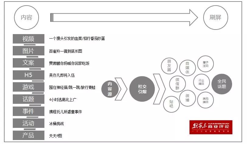 能够从“内容”到“刷屏”,中间涉及“内容源”,可以是上述的游戏,也可以是图片、视频等,通过各类社交平台的“社交引爆”进而形成“刷屏”之势。
