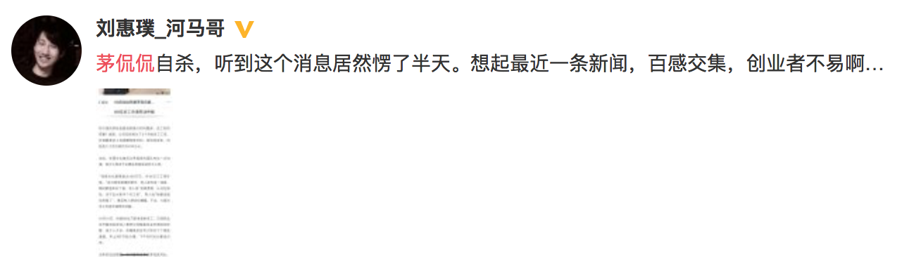 1月25日,有消息称“80后”创业标杆人物茅侃侃于近日过世,终年34岁。界面新闻从可靠信源确认,茅侃侃昨天在家中开煤气自杀,家人发现时已去世,未留下遗书。