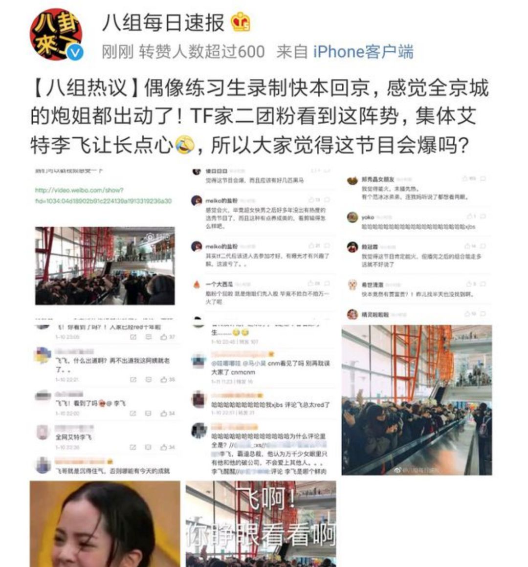 不仅线上讨论度大,《偶像练习生》在线下也弄出了不小的动静。练习生们录制《快乐大本营》后回京,引来了数量庞大的粉丝接机。未出道新人竟有如此待遇,直接震动了国内偶像粉圈。