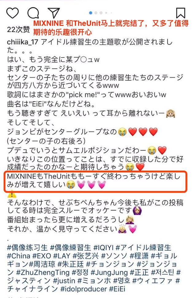 更天时地利的是,《偶像练习生》的播出档期,正值2档人气韩国偶像选秀综艺《MIXNINE》和《TheUnit》完结,而练习生们不乏有韩国背景的成员。如此一来,就出现了不少“爬墙”的外国韩流粉丝。