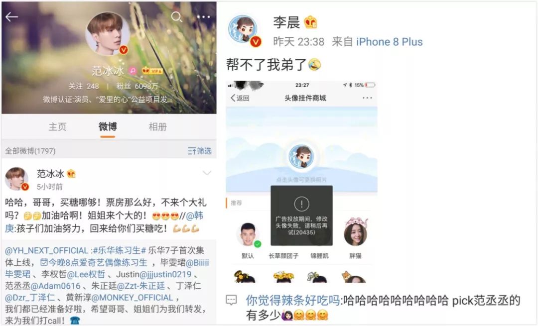 《偶像练习生》播出后2小时内,就有#范冰冰头像#、#范丞丞#、#偶像练习生#、#张艺兴balance#、#李荣浩表情#、#周洁琼#、#陈立农笑容#、#蔡徐坤台风#、#李晨#等18个关联词相继登上微博热搜。