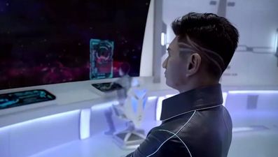 接下来,场景来到散发着蓝色幽光的太空战舰内部。