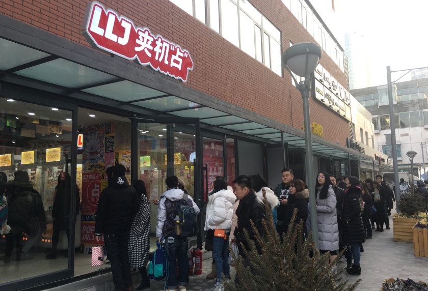 周日下午四点出头,气温不过几摄氏度,街上还偶尔卷过一阵凛冽的穿堂风。横穿那条曾经开着“海小姐的玫瑰饼”的三里屯“脏街”,就可以看见那条长队了。近30个人裹着厚厚的羽绒服和棉袄排在“LLJ夹机占”的门口,他们大多两两一对,或闺蜜或情侣,看上去年龄并不大。
