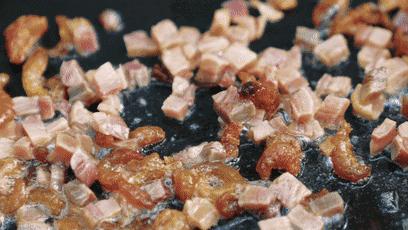 4.锅内加入少许麻油爆香金钩海米和火腿丁;