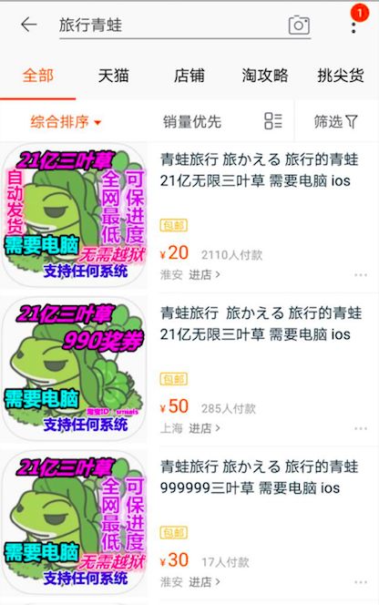 甚至在各大游戏商店里,有些国内者开发者已经上线了跳一跳和旅行青蛙结合的山寨版,淘宝店铺里《旅行青蛙》的破解软件也销售火爆。