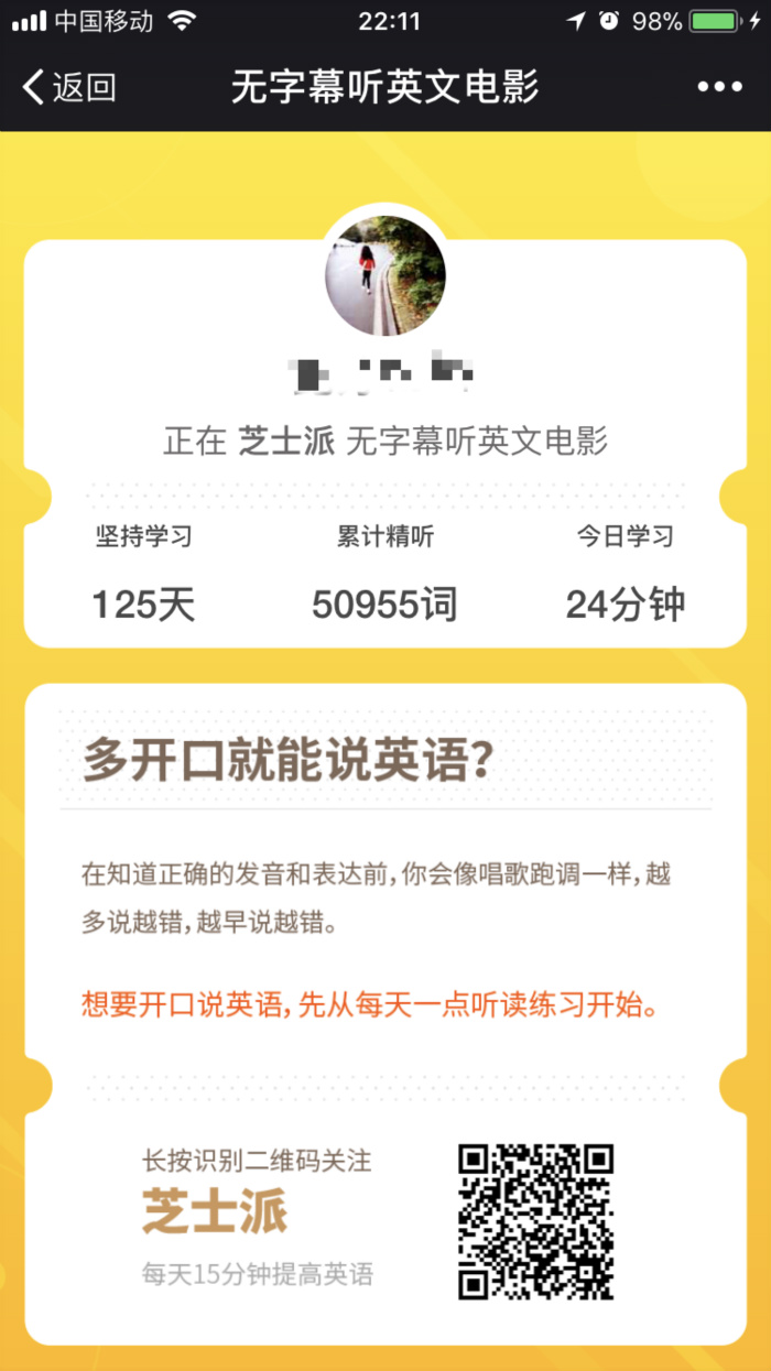 “XXX正在芝士派无字幕听英文电影,坚持学习XX天,累计精听XX词”、“扇贝打卡第XX天,阅读了X篇文章,学习时间XX分钟,等你来改变”……类似的分享语在我们的朋友圈里刷屏了有一段时间了。一个人打卡有点傻,两个人打卡不稀奇,但如果十几二十个人天天打卡呢?会不会鼓动起你的好奇心,跟着开始自己的第一本原版书的阅读,或第一次原版电影的听力练习?