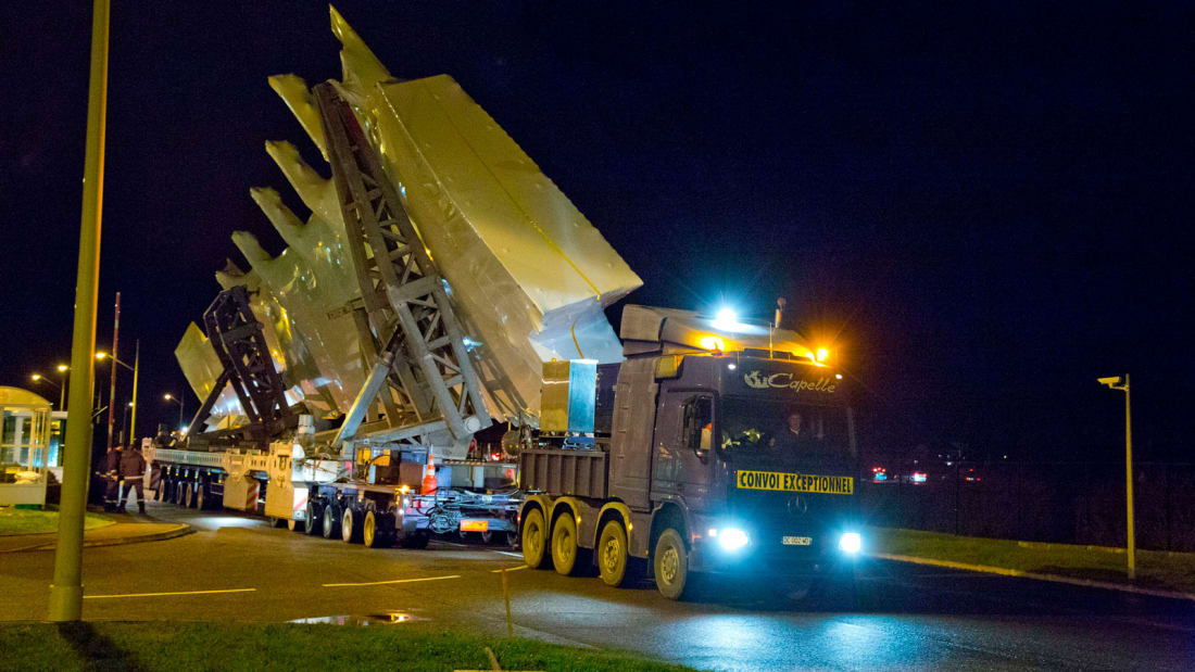 当各个主要部件都到达朗贡后,它们会被转移到一辆特别设计的拖车上。六个部件到齐之后,前往图卢兹的公路旅程就开始了。