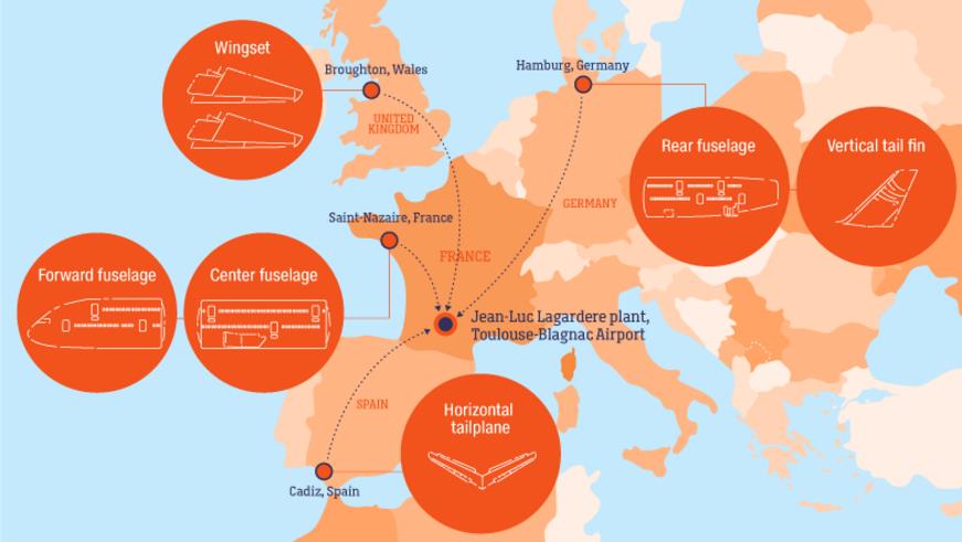 这一特大型喷气式客机的机翼在英国威尔士的布劳顿(Broughton)建造,机身部分来自德国汉堡和法国圣纳泽尔(Saint-Nazaire),水平尾翼来自西班牙的加的斯(Cadiz),垂直尾翼同样建造于汉堡。