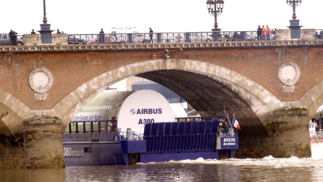 空客公司通过三艘特别设计的船舶组成的船队,将A380的主要零部件运往法国大西洋海岸内陆的波亚克市(Pauillac)的一个浮船坞。