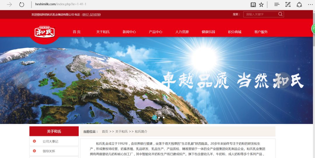 官方网站显示,和氏乳业成立于1992年,由世界银行援建,坐落于得天独厚的"生态乳都"陕西陇县。20多年来始终专注于奶粉的研发和生产,形成集牧场经营、奶畜养殖、乳品研发、乳品生产、产品质检、精准营销于一体的全产业链集团化乳制品企业。