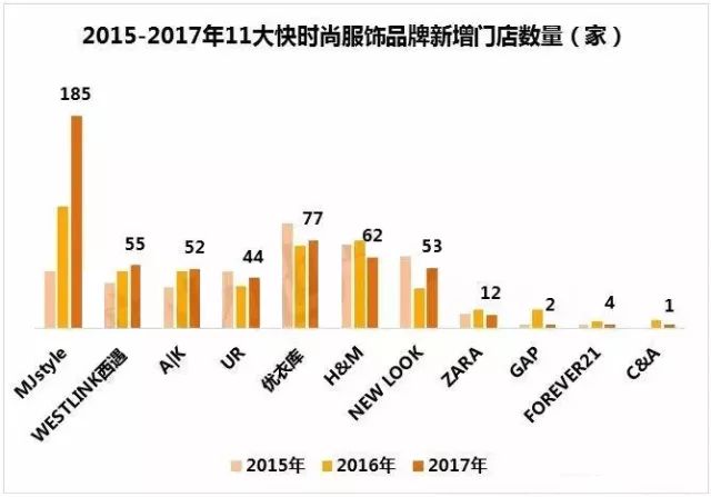 但2017年,11大快时尚服饰品牌在中国内地共拓店547家,同比2016年上涨了15%。且本土快时尚拓展速度已赶超国际快时尚,其中,MJstyle、Alexander Karl(简称A|K)、西遇近两年拓展速度均在50家以上。