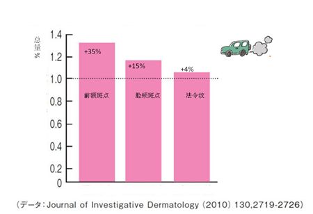 2010年,有研究调查了400名住在德国的白人女性24年来受到的大气污染影响。结果发现在空气污染严重的地方(一天有1万台车以上通过的道路100米内)居住的人,额头和脸颊有更多数量的斑和皱纹,还有法令纹等老化现象。①Journal of investigative dermatology (2010) 130,2719-2726