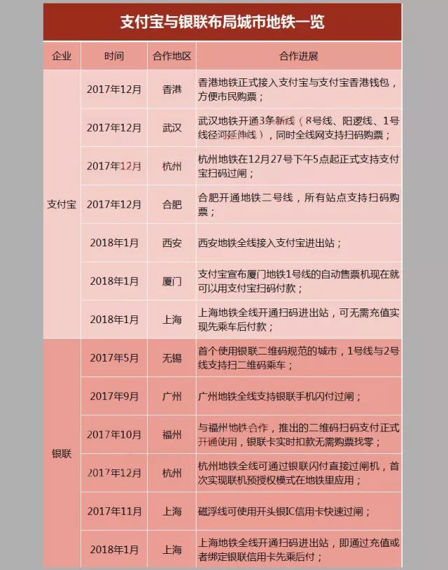 从这一张图可以看出来,目前移动交通仍处于试行状态,只有少部分城市开通了移动支付功能。但从合作进展来看,可以发现支付宝、微信、银联都在开发移动支付,并且从地铁扩展到公交车。