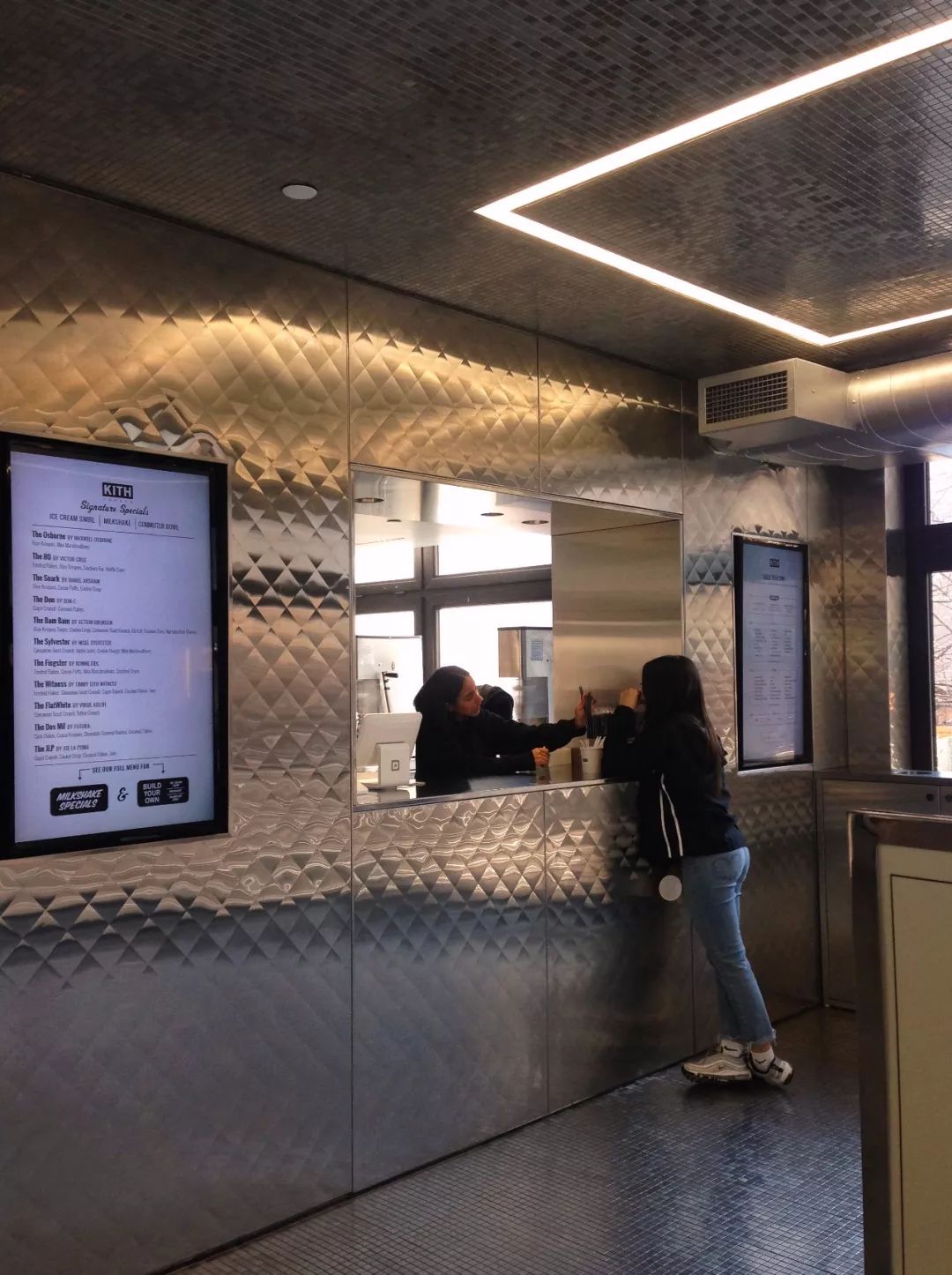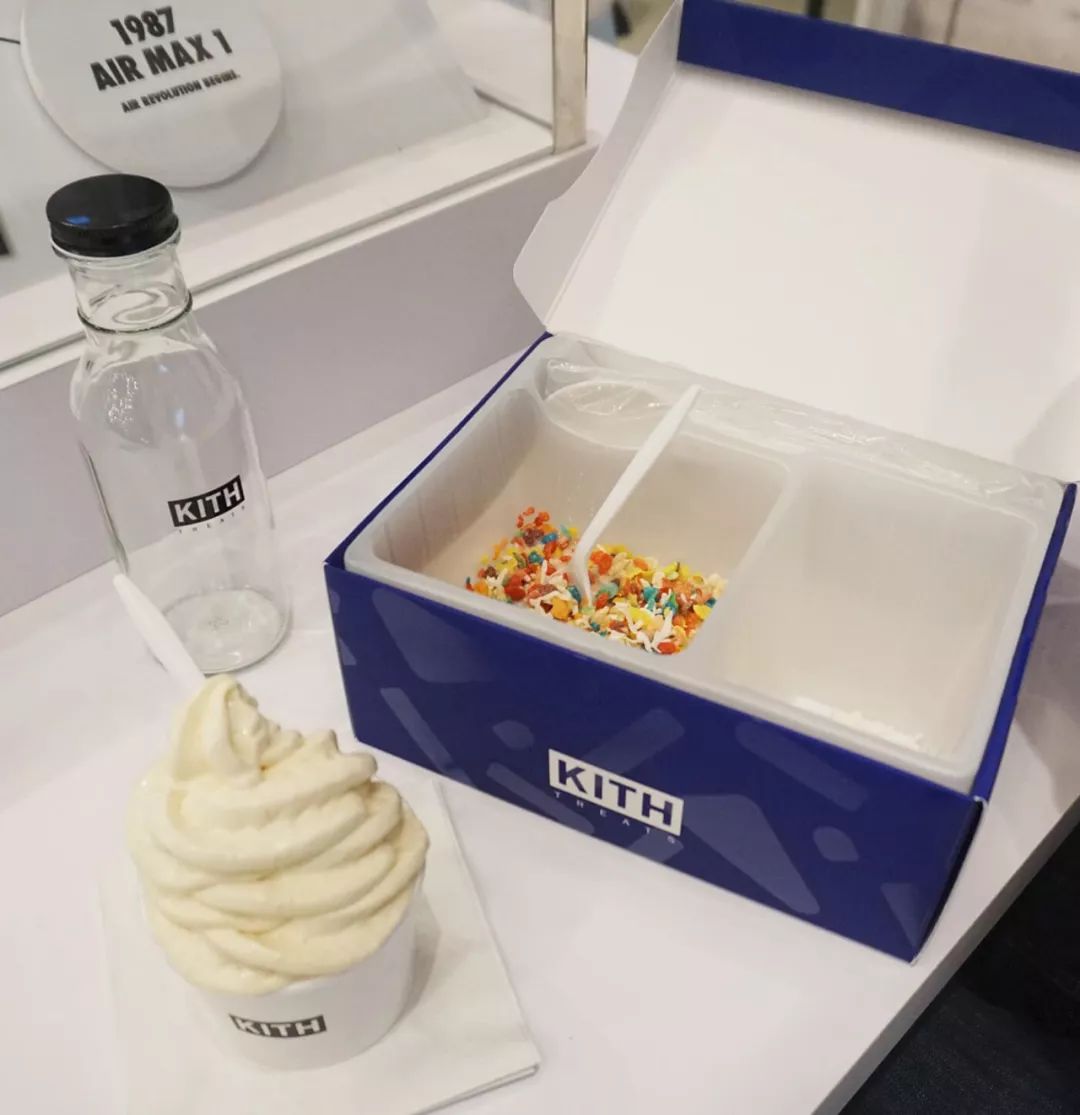 名叫Kith Treats的小吃铺贩卖多种口味谷物牛奶和冰激凌,荣尼本人据说从十一二岁到二十五岁每天起码吃两顿谷物牛奶,不过在店里卖美国最普通的青少年早餐不仅仅因为有钱任性,也不仅仅是噱头,首先食物提供者是荣尼的好朋友,也就是风靡纽约的Baked By Melissa的创始人之一。其次,Kith Treats设在二楼鞋区旁边,没有座位,让买不起Kith的青少年也可以进来玩久一点,青少年端着盛放食物的鞋盒(是真的)站着聊天,这种随意的体验别无分号,实在是非常纽约,像在街边流动餐车上买一根热狗站着吃一样自然。