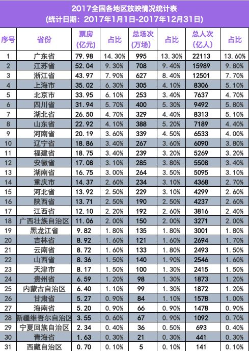 与2017年年度票房突破550亿元同样喜人的是,全国31个省市自治区电影票房全面普涨,其中西藏、宁夏、海南、贵州四地票房涨幅超过25%。广东、江苏、浙江等18省市票房突破10亿元。