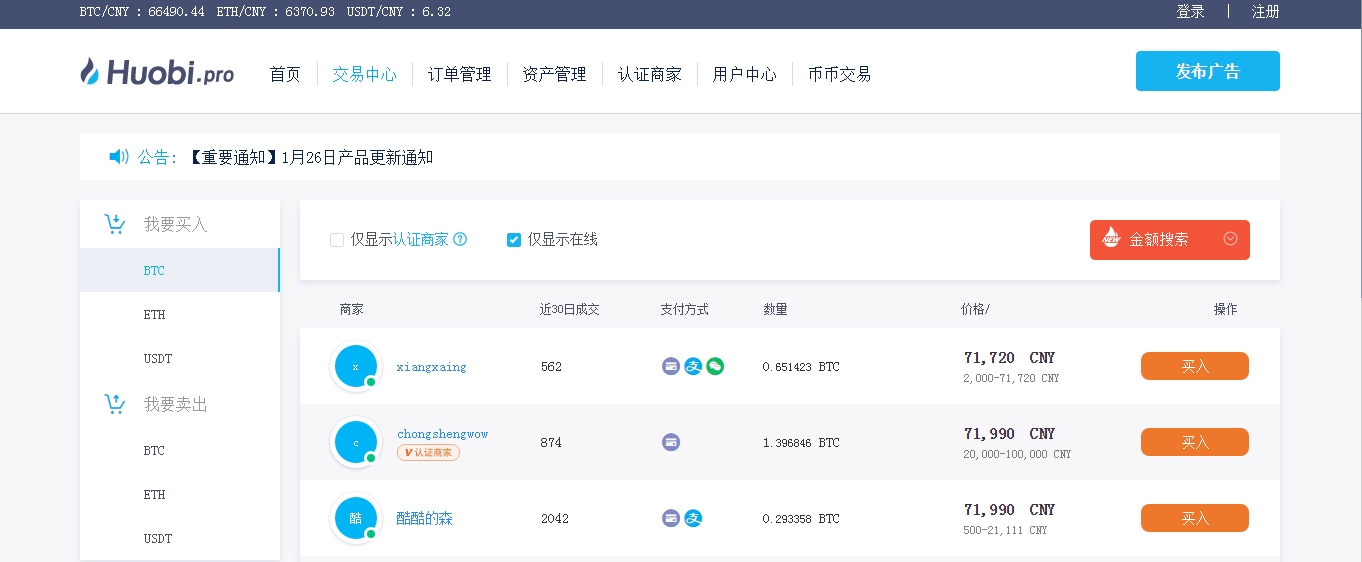 虽然去年9月至10月底,场内交易市场被关停,但国内三大比特币交易所火币网、OKCOIN、比特币中国等迅速上线了点对点的场外交易市场。在这种场外交易方式中,买卖双方进行不连续报价,大多通过个人的支付宝、微信和银行卡渠道进行个人转账交易,而交易所则往往扮演了做市商、担保商等服务。