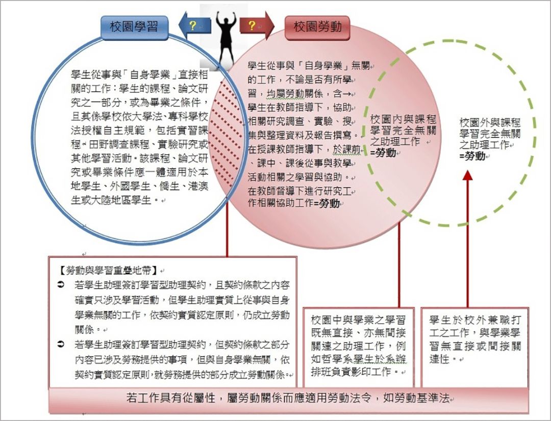无论如何定义“劳动”,劳工一词的意涵仍是为雇主的事业劳心劳力,从而获得报酬的工作者。研究生从事协助性的教育工作时,虽然经常先获得教师的指导而有所学习,但是所处的位置已不再是受教者,而是分担了教师所承担的学术劳动工作,从而转换地位为劳动者。当学生由“教师学术劳动的接收者”转变为“协助教师提供学术劳动工作的授与者”,不论是组织课业讨论的学习性质活动,还是协助准备资料或设备等非创造性工作,都不再是单纯的学习活动,而是劳动工作。