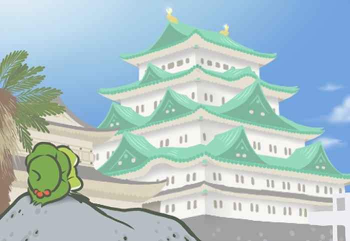 和大阪城、熊本城等并称为日本的三大名城,最初由日本战国时代的著名武将德川家康于1612年修建,在二战期间被战火损毁,1959年,幸存的建筑得以修复。如今,城的中心地带为本丸区,名古屋城的主建筑天守阁便位于本丸区内西侧,也就是青蛙在明信片中遥望的那栋古建筑,本丸区东南处为本丸御殿遗迹,两角则分别筑有西南角楼和东南角楼。