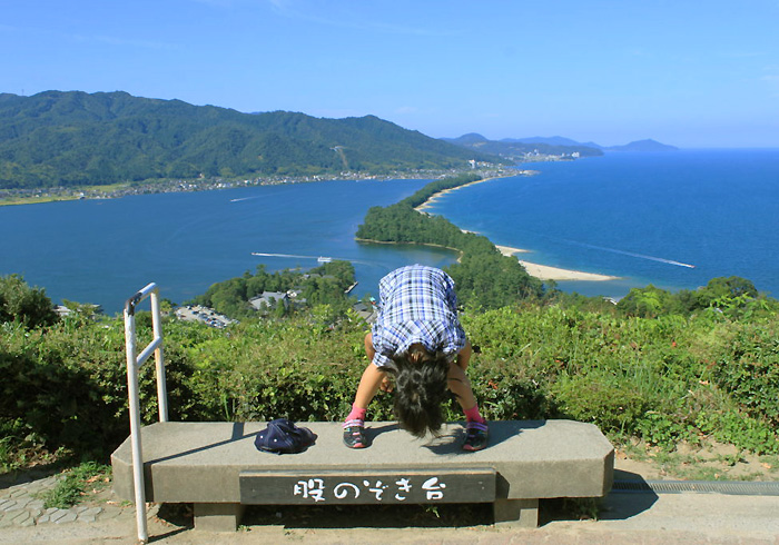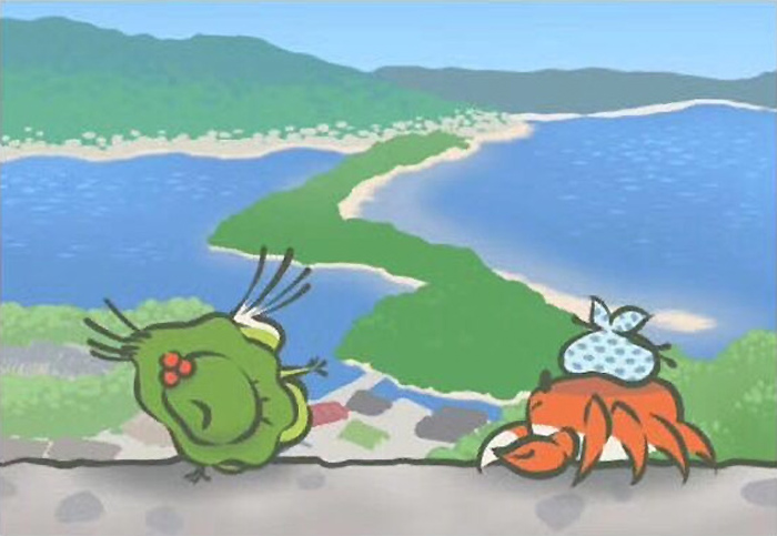 位于日本的京都府北部,在一处全长约3.5公里、宽40~100米的沙洲上,由于其坐落于碧蓝的海上,形似天降的一座白色架桥,因而得名“天桥立”。天桥立的两侧有绵延的山峰,最好的观景方式其实是在山上远观,譬如步行或坐缆车抵达山上的观景台,并且像蛙儿在图中摆的POSE那样,将腰弯下,头从两腿之间的空隙“倒过来”欣赏天桥立,就像是一条通往天上的桥,这也是图中青蛙所摆的姿势。