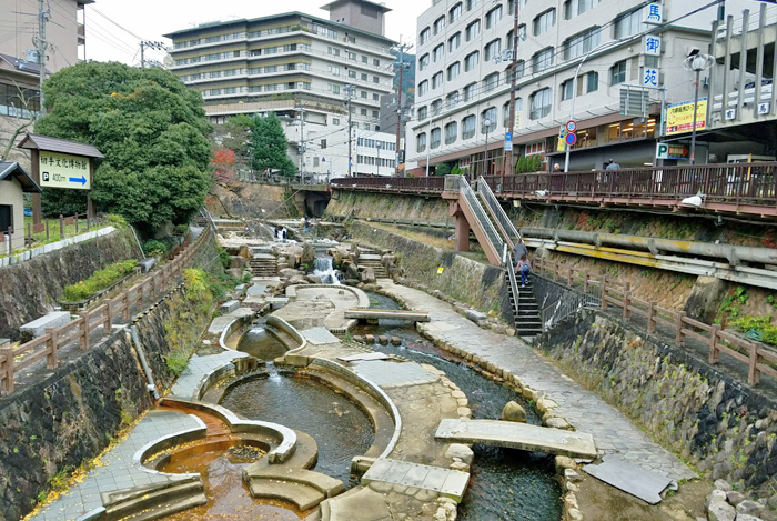 图片中青蛙所站的地方是当地的温泉街旁的河道,值得一提的是,有马温泉街周边大大小小的温泉口非常多,而且各具特色,譬如对治疗神经痛有疗效的金之汤、对肠胃病效果卓著的银之汤,以及对皮肤瘢痕有修复奇效的太阁之汤等。公共的温泉浴场旁,往往还提供免费的足汤可泡。
