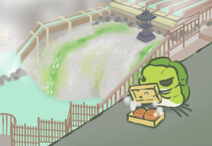 草津温泉乡街中有一处泉眼名为“汤畑”,终年热气蒸腾,高温的泉水不断从地下流淌,图片中小蛙站的地方就是汤畑温泉口旁边,而它手中的点心肯定是草津出品的“温泉馒头”,这种以温泉水和面、用温泉蒸汽熏蒸的特产在日本大部分温泉景点都有售卖,还有温泉蛋、温泉布丁等,都是非常好的伴手礼。