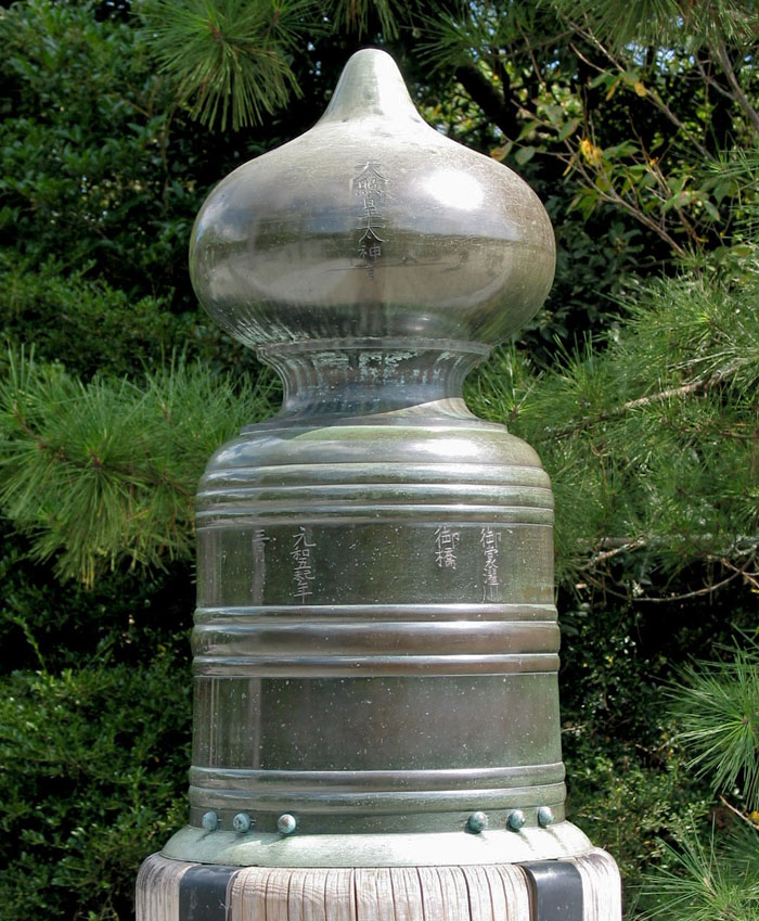 具有拟宝珠的桥在日本比比皆是,但最有名的恐怕要属伊势神宫外的宇治桥,它毗邻日本神道教里位阶最高的伊势神社,是传说中俗界与圣界的分界,也寓意着从现世通向彼世的路途,故而将宇治桥视为心灵的归宿。在宇治桥的“拟宝珠”栏杆上,还刻有伊势神宫供奉的天照大神的内宫“天照皇太神宫”,难怪蛙儿不惜爬上基底座也想朝拜一番。
