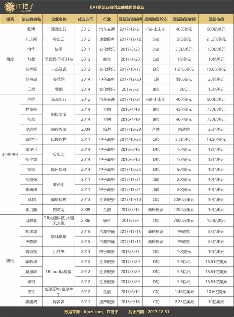 这些企业的背后基本都有着资本巨头的撑腰,而站在这些独角兽背后的掌舵者,往往也出身不凡。他们或是有巨头企业的工作经历,被称为大公司派系创业者;或者是有高等学府的学习经历,被称为高校派系的创业者;又或者,他们都曾在知名的商学院进修过,被称为商学院派系。今天 IT 桔子(ID:itjuzi521)就盘点了那些从 BAT(百度、阿里巴巴、腾讯)走出来的创业者和他们创立的独角兽公司。