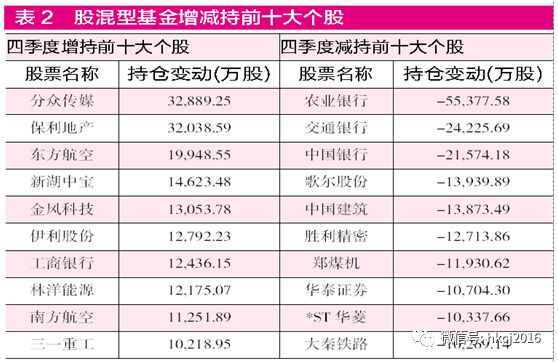 而从个股来看,权益类基金四季度增减持个股亦完整曝光,来自好买基金研究中心的统计表明,分众传媒、保利地产、东方航空成为四季度公募增持最多的三只股票,其分别被增持了约3.29亿股、3.2亿股、1.99亿股,分属传媒、地产、交运三个不同的行业;有趣的是,公募当季减持最多的三只股票却均来自银行业,分别是农业银行、交通银行、中国银行。此外,若从持股的基金数量而论,中国平安、贵州茅台、伊利股份依然牢牢占据着前三席。