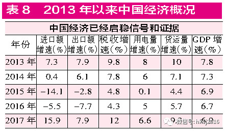 表8是过去几年,中国经济的基础数据。这些数据都从更本质的层面反映、揭示了中国经济的状况:最近几年,我国进口额、出口额、税收增速、用电量增速、货运量增速要比GDP增速更直接、更本质地揭示了中国经济的状况。几个经济的基础指标表明,中国经济在2014年出现了疲软,明显的困难期发生在2015和2016年,到了2017年各项基础经济指标数据都大幅度地回升。几乎已经升到了相对比较好的2013年的水平,甚至个别指标已经超过2013年的增速。这组经济指标铁板钉钉的证明,中国经济发生类似于美国那样的大崩溃是完全不可能的。