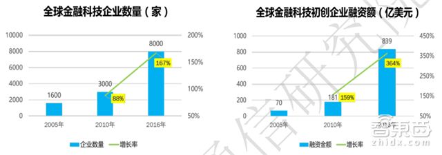 波士顿咨询公司的研究数据显示,2016 年全球金融科技企业数量增长了 167%,达到8000 家,是 2015 年的约 2.7 倍;2016 年全球金融科技初创企业融资额增长了364%,达到 839 亿美元,是 2015 年的约 4.5 倍。