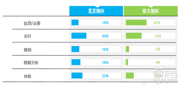 其中,北美地区金融科技市场较为成熟,各细分领域的企业融资规模相对均衡,侧重于为消费者提供更加便捷的金融服务;在亚太地区金融服务水平相对滞后,仍存在大量未开发市场,金融科技使金融服务触及海量长尾用户(市场需求广阔,发展潜力巨大)。